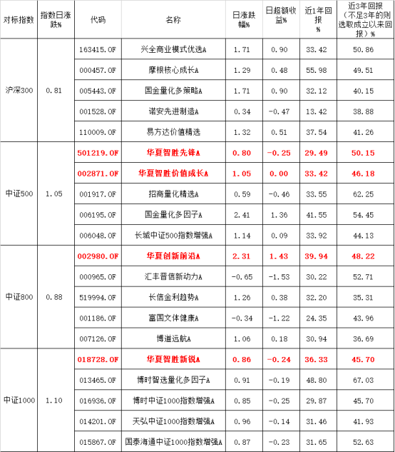 回看昨日成绩,由于市场继续波动,昨日市场普遍修复,但由于指数分化极其突然——比如一向偏弱的小盘股昨日突然爆发,不少基金还是没有“反应”过来,暂时跑输对标指数,不过也有不少产品取得不错成绩。比如对标中证800的$华夏创新前沿股票C(OTCFUND|025541)$,跑赢指数1.43%,成为昨日超额冠军,其年收益也来到了39.94%,成为同类第一。总体而言,对标沪深300、中证500的产品表现较好,而对标中证1000这种波动较大的,意外在所难免。