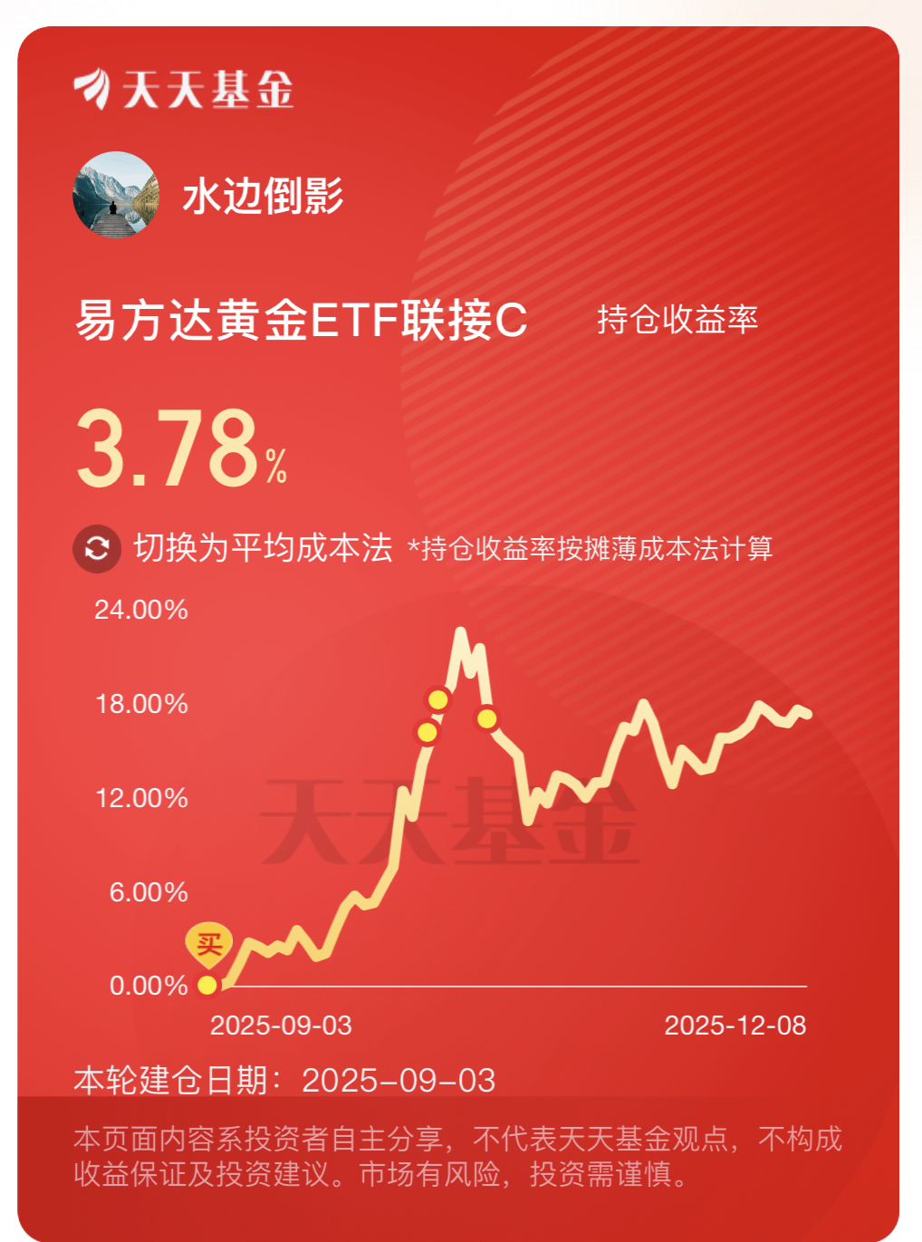 黄金今天有所调整,不过我觉得是个低吸筹码的机会。央行都连续12个月增持了,硬需求摆这儿呢。短期降息预期、地缘冲突也就是让金价起起伏伏,大方向还是往上走。我加点$易方达黄金ETF联接C(OTCFUND|002963)$这基金费率低、跟金价准,现在买刚好趁调整捡点筹码,既能拿黄金避险,又能跟着长期趋势赚点,稳稳的。