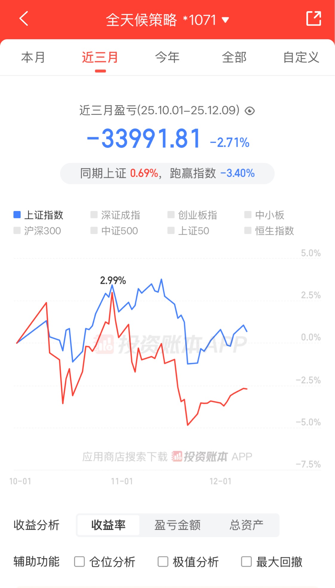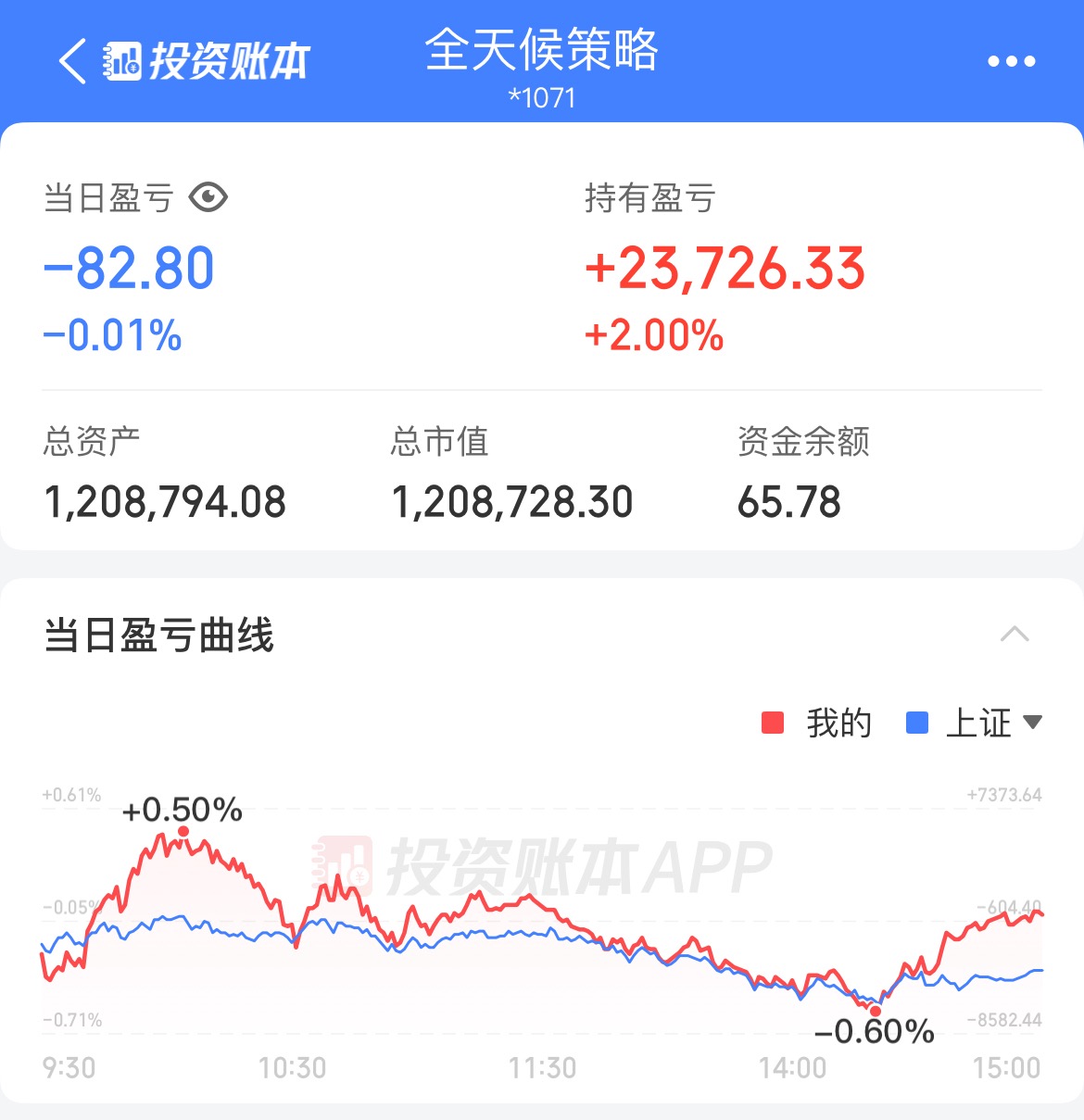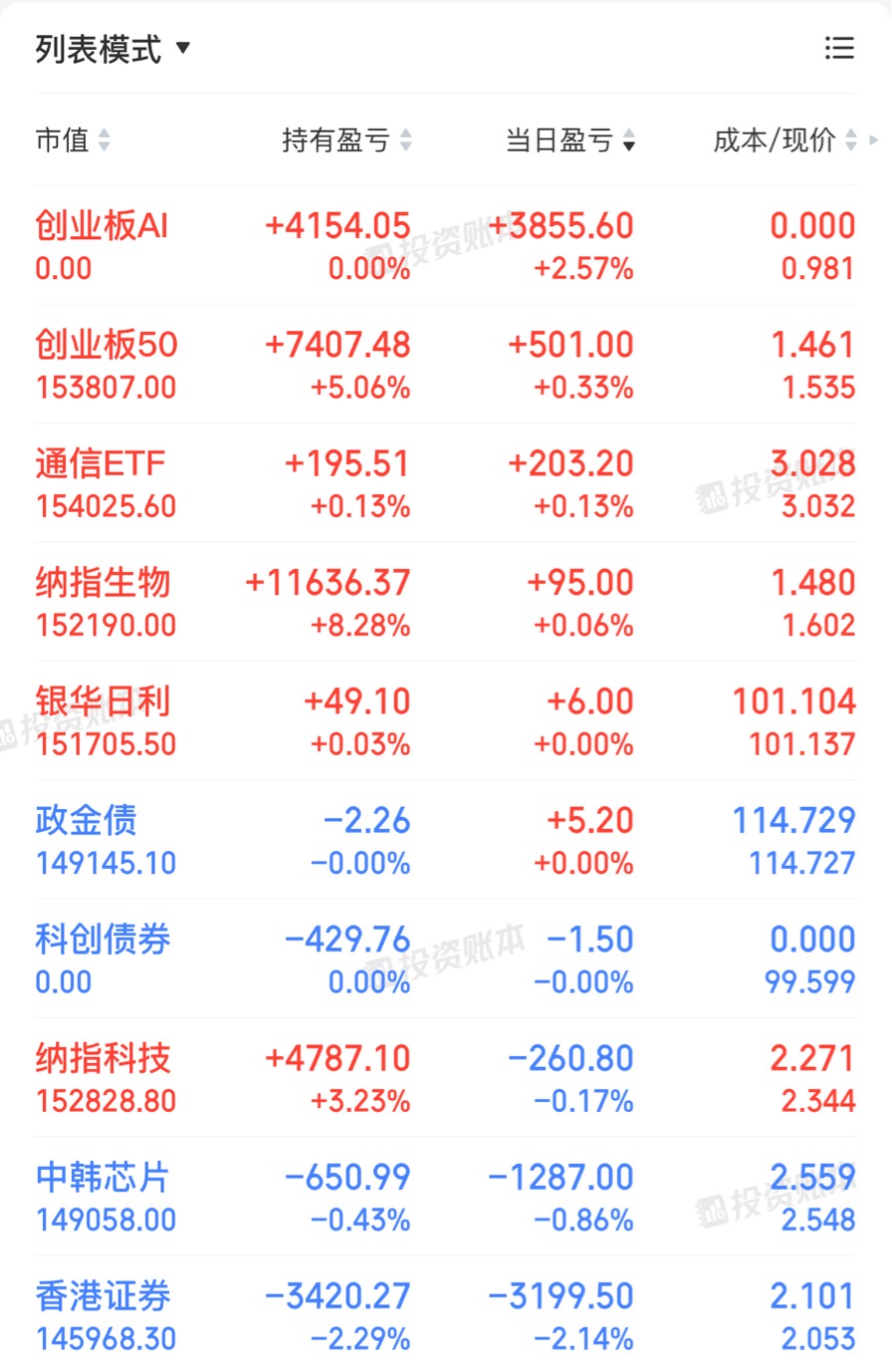 今日账户亏损:83元。 12月9日,截至收盘,上证指数跌0.37%,深证成指跌0.39%,创业板指涨0.61%,北证50跌1.72%。全市场成交额1.92万亿元,较上日成交额缩量1340亿元。 ETF收盘涨跌不一,通信ETF(515880)领涨3.09%,5G50ETF(159811)涨2.93%,5GETF(159994)涨2.85%。黄金股ETF(517520)领跌3.54%,工业有色ETF(560860)跌3.48%,有色50ETF(159652)跌3.43%。