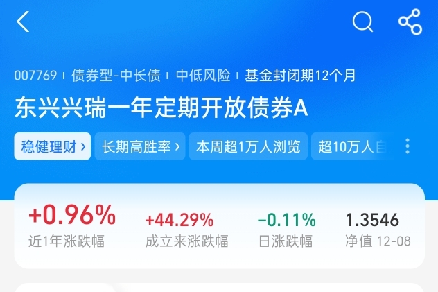 还不错呢!东兴的债基开放申购啦,近期市场经过调整后,正逐步回暖上涨。$东兴兴瑞一年定开A$ $东兴兴瑞一年定期开放债券A$ 近一年收益有96个蛋,长期持有回报率不错,基金抗波动能力强、长期胜率高,期待一下,东兴鑫颐3个月滚动有,今天预计收蛋4个,是低波固收+,含可转债,在股市好的时候也能吃上收益。