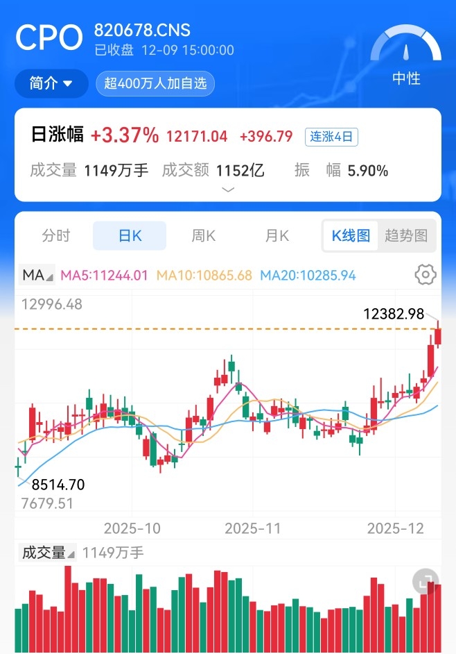 近期日线级别从11月底至今期间整体涨多跌少,日K线高低位置不断上移,今天再创这轮上涨新高。在我看来CPO板块已经反转。昨天我讲到短期不排除走二波,所以昨天我少量右侧,就是博弈短期继续冲高可能,今天再度上涨说明晓勇昨天观点是对的。上面也讲了当前已经出现反转信号,所以短期我看继续上攻,我个人选择继续坚守此方向!