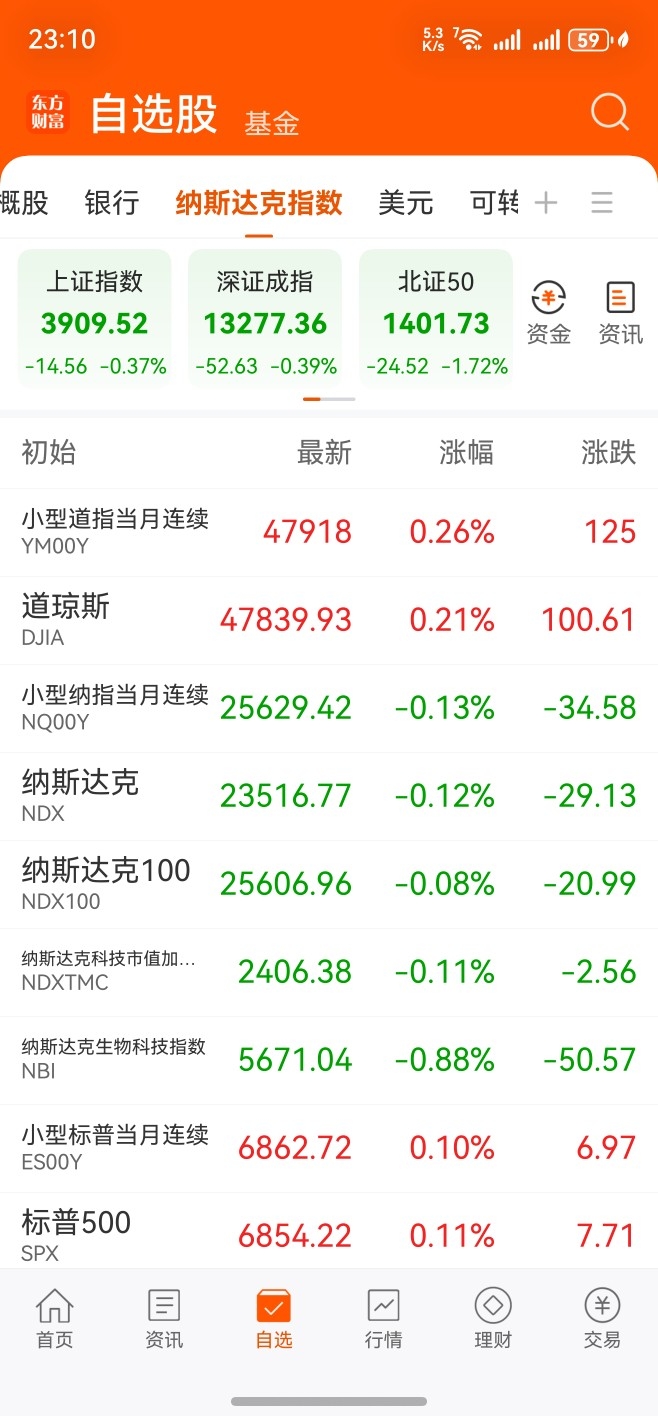 在今天晚上23点10分,目前观察美股三大指数里,美股道琼斯指数、标普500指数,