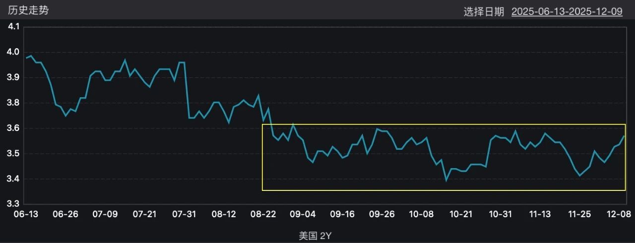 从昨晚的市场来看,美股震荡的同时,美债继续上行,2年期美债上行4bps,重回3.6%上方——从8月底开始交易降息预期开始,2年期美债就在3.4%-3.6%的区间,持续窄幅震荡,下图。