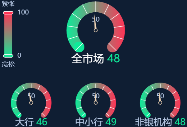 六、资金面情绪指数:全市场48 资金面趋松 (0-100紧张度递增,50为均衡,超过50反映资金紧张)