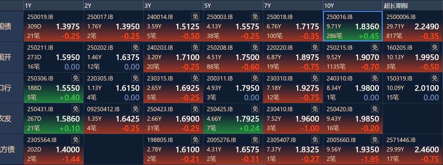 二、十年期国债收益率:1.836 0.0045%(国债收益率越涨,债市越跌,两者反向关系)