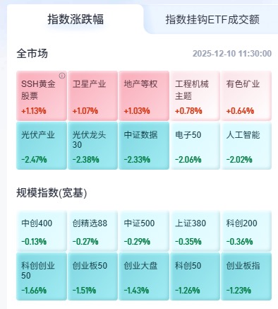 黄金股、卫星产业、地产等权等涨幅靠前,光伏产业、中证数据、电子50等跌幅偏大。