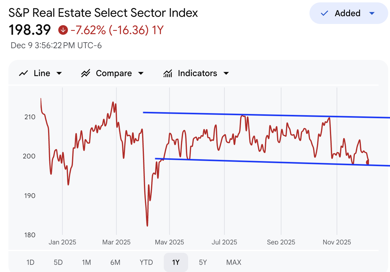 标普房地产板块:该板块近期处于一个宽幅的高位震荡整理区间。指数在经历冲高回落后,未能有效突破上方阻力,并出现了显著回撤,短期走势偏弱。当前正在向横向震荡区间的下沿靠拢。能否有效守住长期箱体下沿支撑,是决定其震荡整理格局能否延续的关键。