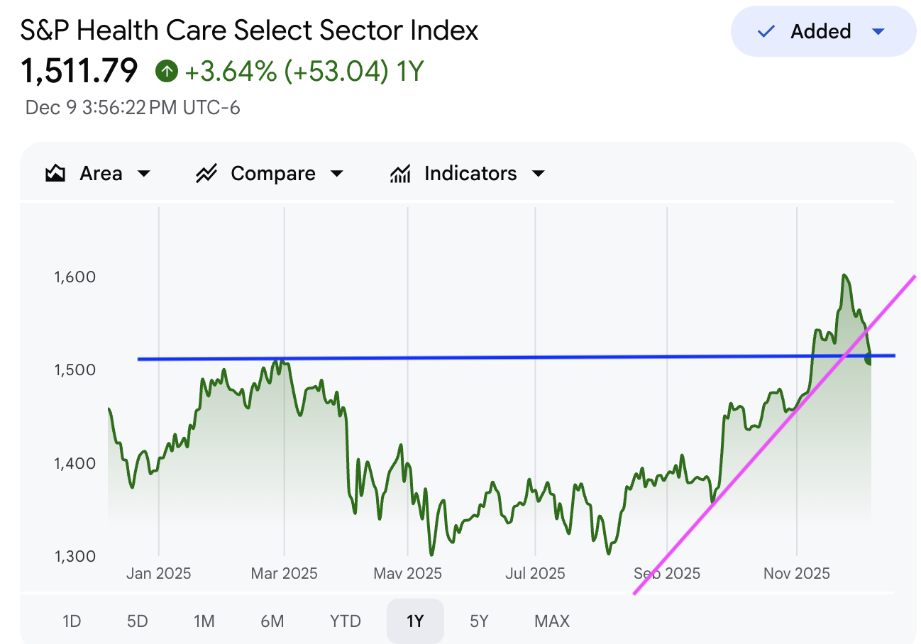 标普健康保健板块:该板块在经历了较长时间的底部筑底后,成功突破上方的长期阻力平台,正式转为震荡上行趋势。然而,近期回调已跌破短期上涨趋势线,上攻动能有所减弱,确认短期已经进入调整或震荡周期。后市关键在于能否守住前期突破的长期阻力平台(即最关键的长期支撑位),这将决定其中长期上行趋势的稳固性。