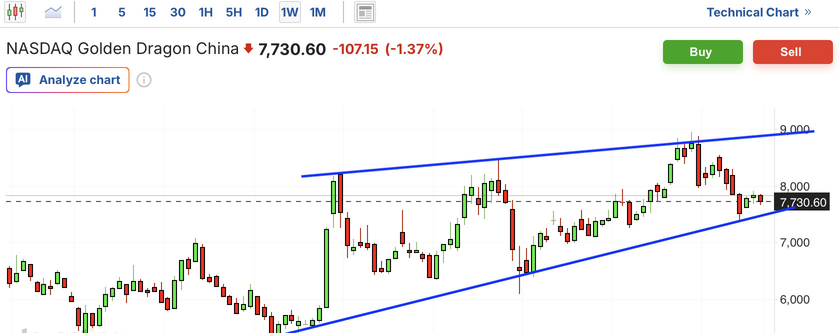中概股: 中概股指数近期处于一个宽幅的震荡整理区间,尚未形成清晰的单边趋势,整体形态更像一个向上倾斜的上升楔形或上升通道。指数在通道上沿遇阻后出现回撤,正在向通道的下轨支撑线靠拢。这几日有止跌迹象,能否在下轨有效获得支撑并反转上行,是决定其短期趋势能否避免恶化的关键。