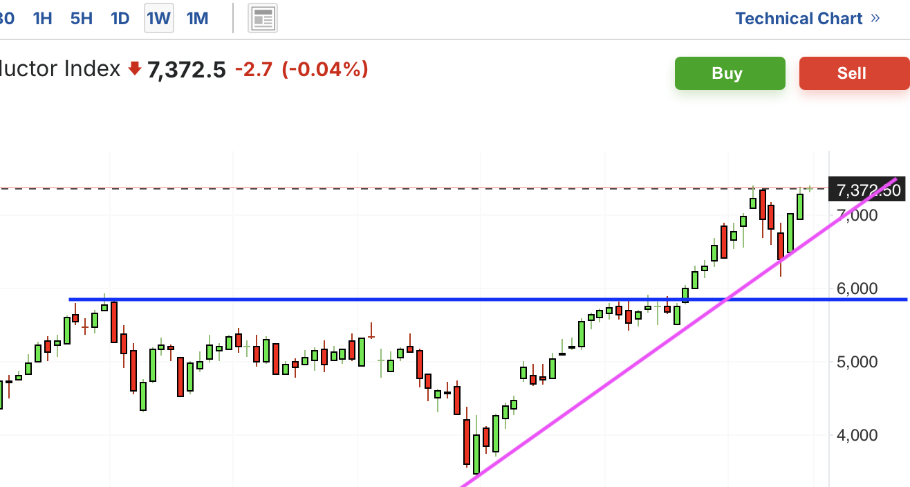 费城半导体指数:受益于人工智能(AI)的强劲需求驱动,费城半导体指数中长期保持极为强劲的上升趋势,其年内涨幅显著超越美股三大指数。在经历短暂回撤之后,指数迅速强力反转并再次确认上行趋势。目前正积极逼近或创出历史新高,虽然突破可期,但鉴于其加速上行,短期内仍存在技术性回调或高位整理的风险。