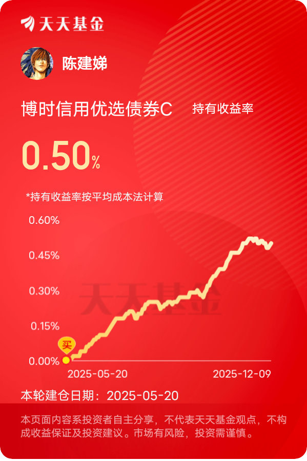 #青禾创作计划# 我一直坚信“从一点一滴做起,积少成多堆沙成塔”的道理,而定投债券基金正是践行这一理念的优质投资选择,既契合普通投资者的资金节奏,又能凭借自身特性实现稳健增值。债券基金本身以债券为主要投资标的,核心收益来自固定利息回报与合理的价差收益,风险远低于股票类资产,即便市场波动,也能凭借稳健属性成为资产组合的“压舱石”,这为定投提供了坚实的安全垫。定投的魅力更在于分散风险、摊薄成本,市场利率波动带来的基金净值起伏,会通过定期定额投入自然平滑,无需纠结择时难题,每月拿出闲置资金坚持定投,低谷时能买入更多份额,高位时自动减少持仓,长期下来形成平均成本优势。当前宏观政策持续释放稳增长信号,流动性环境宽松,信用风险逐步降低,为债券基金的长期稳健运行提供了有利支撑,而定投模式恰好能捕捉这种长期趋势,避免因短期市场扰动做出非理性操作。对我而言,定投债券基金不是追求短期暴利,而是通过持续积累实现财富稳步增长,既适配日常收支节奏,又能在复利效应下让小额资金逐步壮大,尤其适合追求稳健、缺乏专业择时能力的普通投资者,是兼顾安全性与收益性的理想投资方式。@天天基金创作者中心 #晒收益#