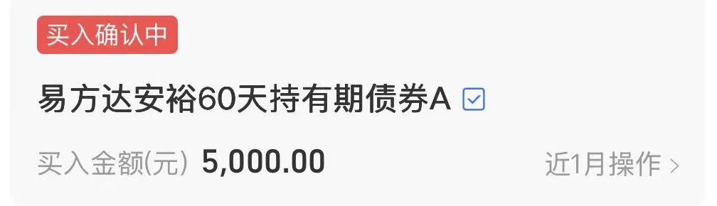 信用债:$易方达安裕60天持有债券A$ +5000元,现在行情不稳定,闲钱放在银行货币里,收益较低,波动大的不想去,今年最后一个月了,为了图稳我打算配置些低波动纯债,短期不打算动或者也想管住手,所以我选择了易方达安裕,它不仅稳收益比银行和货币高不少,它属于一只短债类型,在近期债市震荡当中没有受到太大影响,表现相对稳定,自9月26以来仅绿了2次,基本上不用操心行情问题,主打一个稳,近一年收益率2.16%,回撤仅0.09%几乎忽略不计,长期拿着非常安心,累计收益也很可观,今天先上车,后面加大仓位。