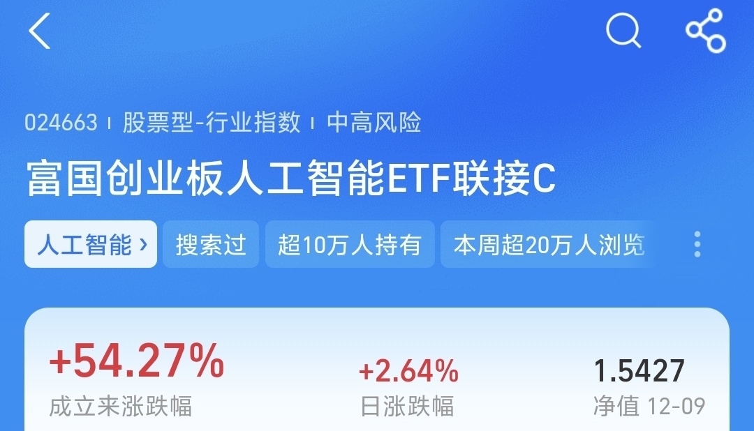 核心标的,12月9日单日涨2.64%,成立以来更是涨54.27%,弹性很好。它紧跟高景气主线,布局硬核资产。这波AI产业调整,我已经果断逢低加点,期待后续不错的表现。