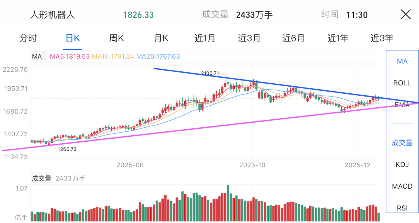 人形机器人:长期上升趋势,短期进入 收敛的三角形态整理尾声。若能在普跌中完成形态突破,有望开启新的行情。若市场恐慌可能导致整理形态被向下打破,从而回踩长期趋势线,表明短期多头力量在高位出现衰竭。