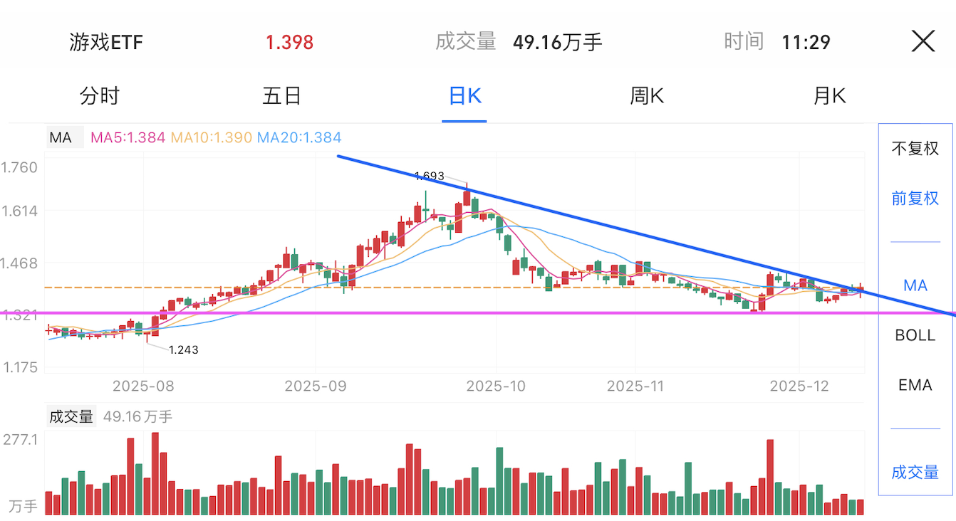 游戏:底部缩量整理,短期受下降趋势线压制,走势偏弱。若能顶住普跌压力,在底部积聚力量,有效突破下降趋势线,将迎来估值修复。普跌环境中,若无法突破,预计将继续在底部区间震荡磨底,甚至有跌破底部支撑的风险。