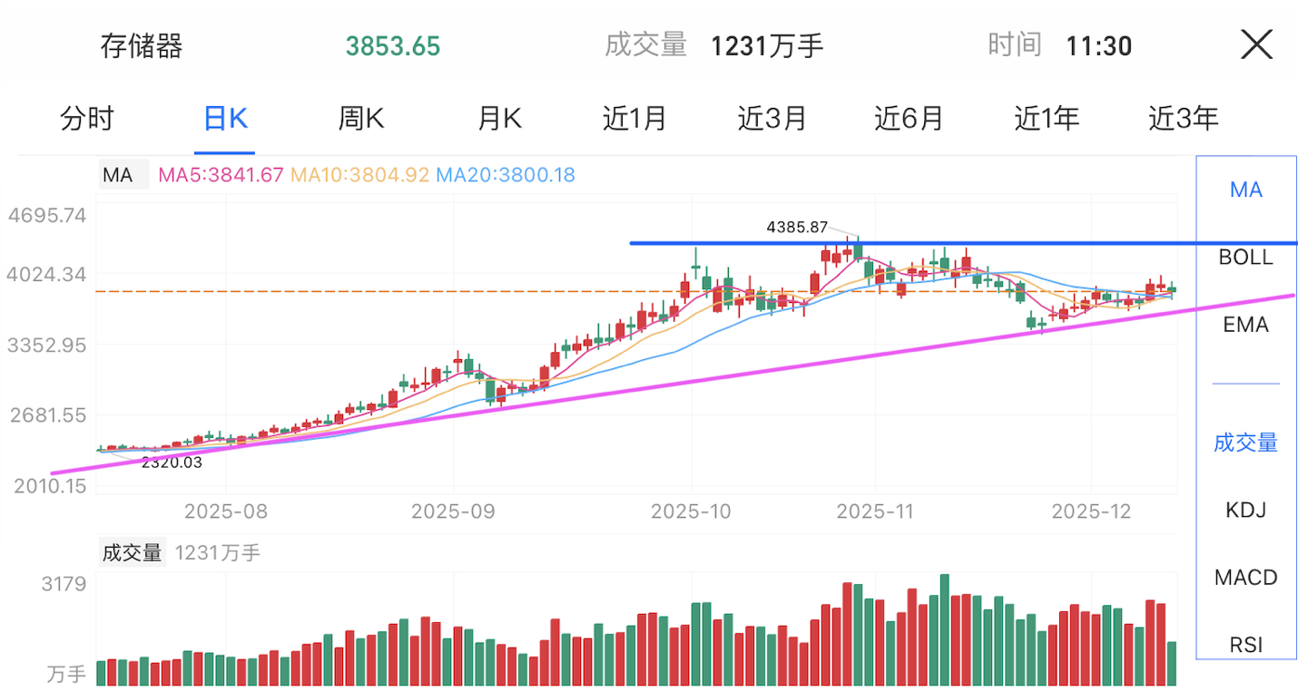 存储芯片:中长期上升趋势,短期经历冲高后维持 窄幅震荡。若能在普跌中稳住支撑位,并最终突破前期高点压力,将确认新一轮上涨行情的开启。普跌环境可能导致资金出逃,若无法突破高点,则可能继续在支撑位附近盘整,等待更强的基本面催化。