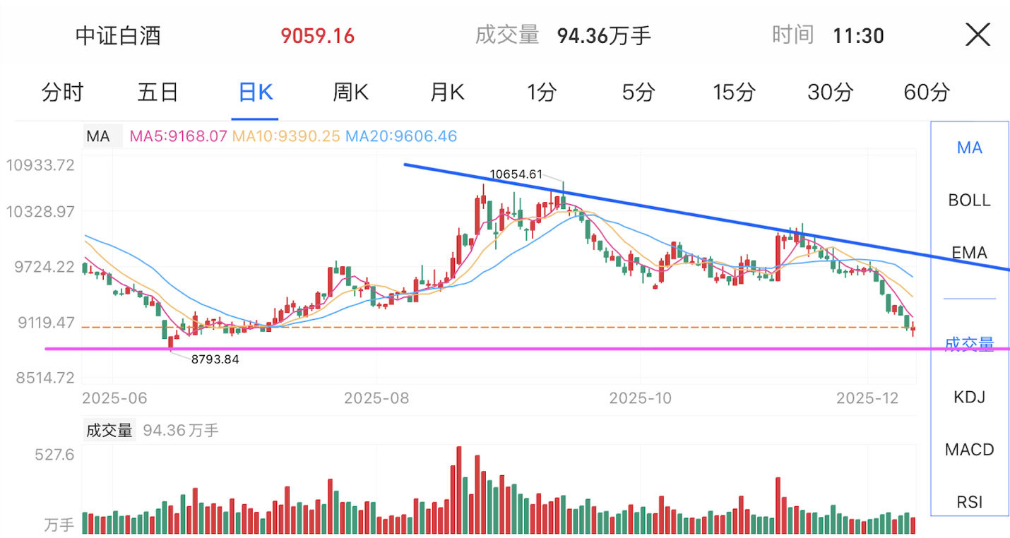 白酒:持续在底部区间缩量震荡,受到清晰的下降趋势线压制。在普跌中若能维持住底部不破,表明其品牌价值的抗跌性。格位于所有关键均线下方,走势极弱。目前逐渐靠近最低点,普跌背景下能否守住支撑位将是关键,需警惕跌破引发的加速下行。