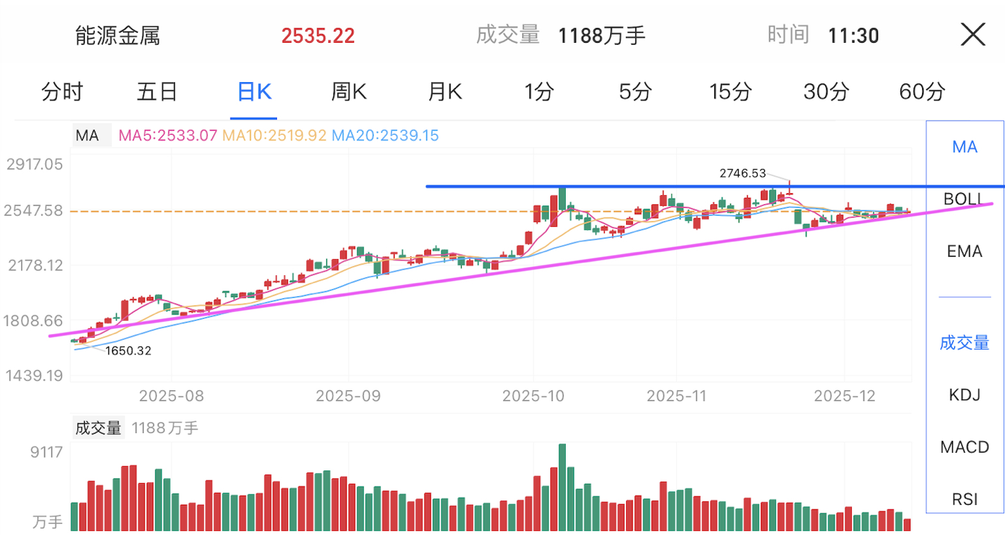 能源金属:回调至前低支撑区域后窄幅震荡。在普跌中继续维持窄幅震荡,表现出较强的底部韧性,一旦基本面出现积极催化,有潜力迎来强劲反弹。成交量能不足,市场情绪谨慎。普跌环境可能打破当前平衡,向下寻找更深的底部支撑。