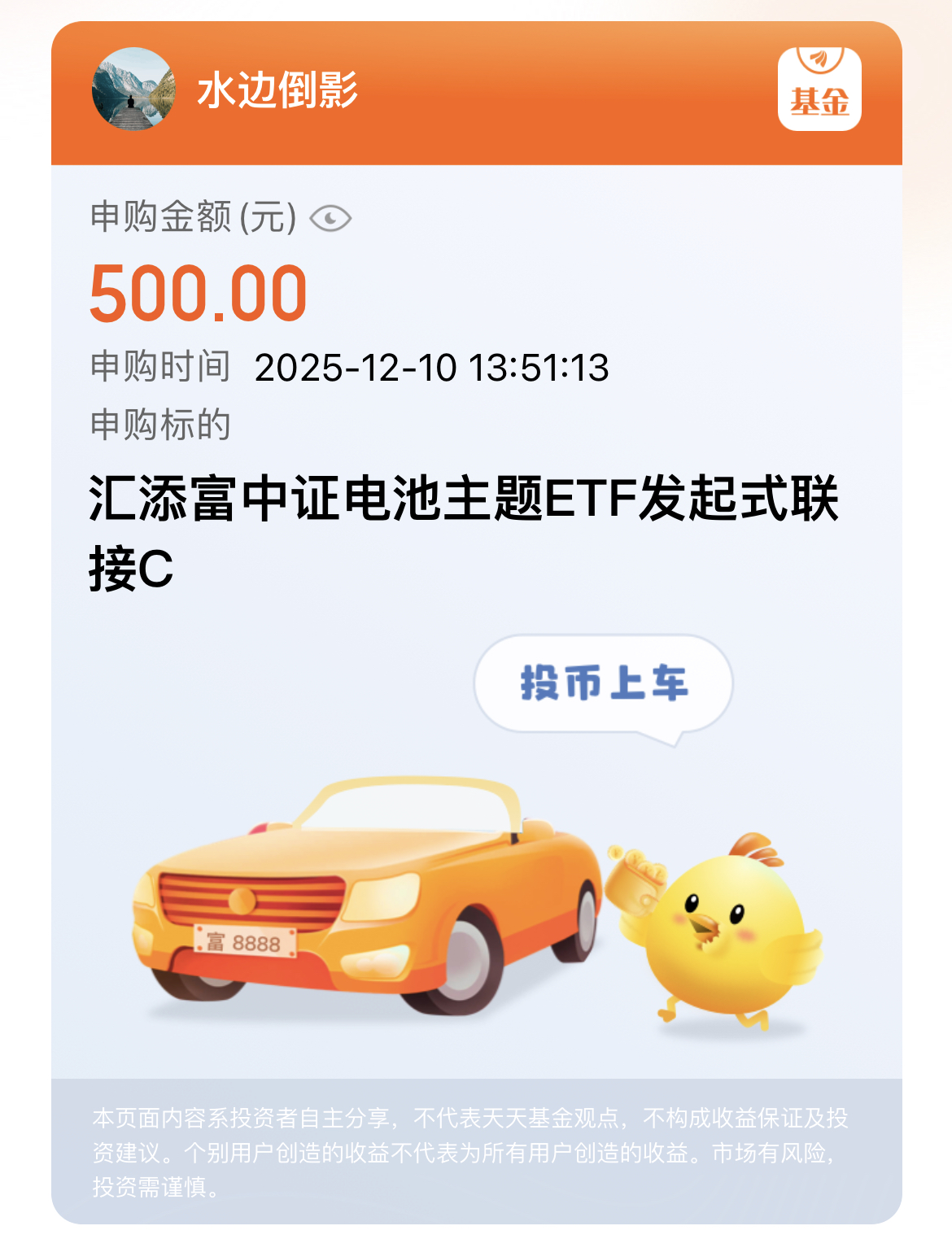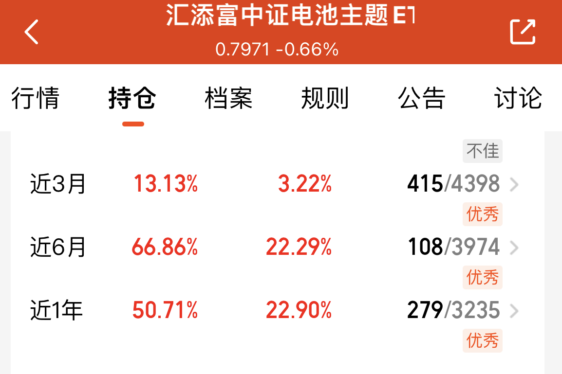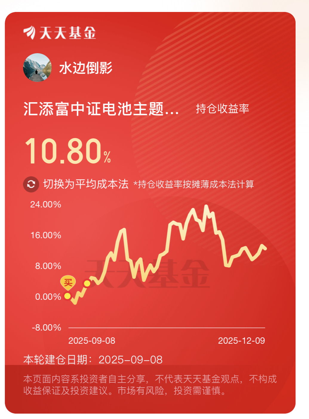 我打算趁这次调整分批加仓500元$汇添富中证电池主题ETF发起式联接C(OTCFUND|012863)$,目前这只基金我持有收益率已有10.80%,近一周上涨1.19%,近半年更是大涨66.89%,长期业绩稳定能打。而且它综合费率仅0.45%,处于同类最低水平,性价比直接拉满,持仓成本更低也更省心。