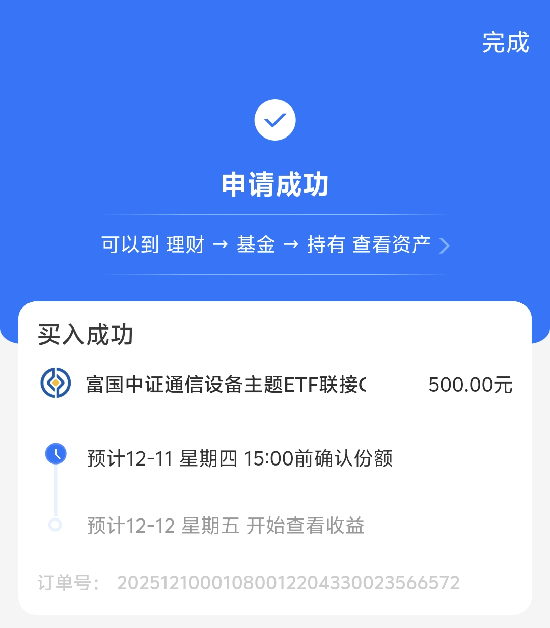 行业报告显示全球数据流量正持续高速增长,这背后离不开通信网络的持续扩容升级。$富国中证通信设备主题ETF发起式联接C$ 恰好聚焦传输、接入等核心环节,与这一趋势高度契合。网络升级是渐进且务实的过程,而流量增长的长期确定性较强,因此我今天买入了1000元。这类投资虽会随产业周期波动,但数字化进程不可逆,支撑技术落地的基础设施值得长期关注,这笔操作正是我对行业趋势的简单个人跟随。