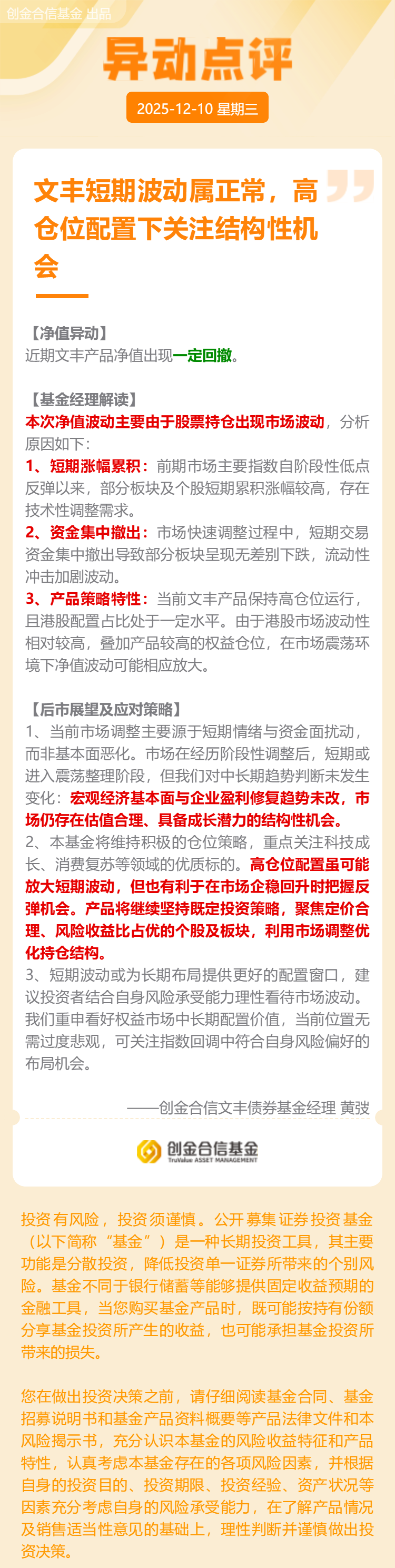 文丰短期波动属正常,高仓位配置下关注结构性机会