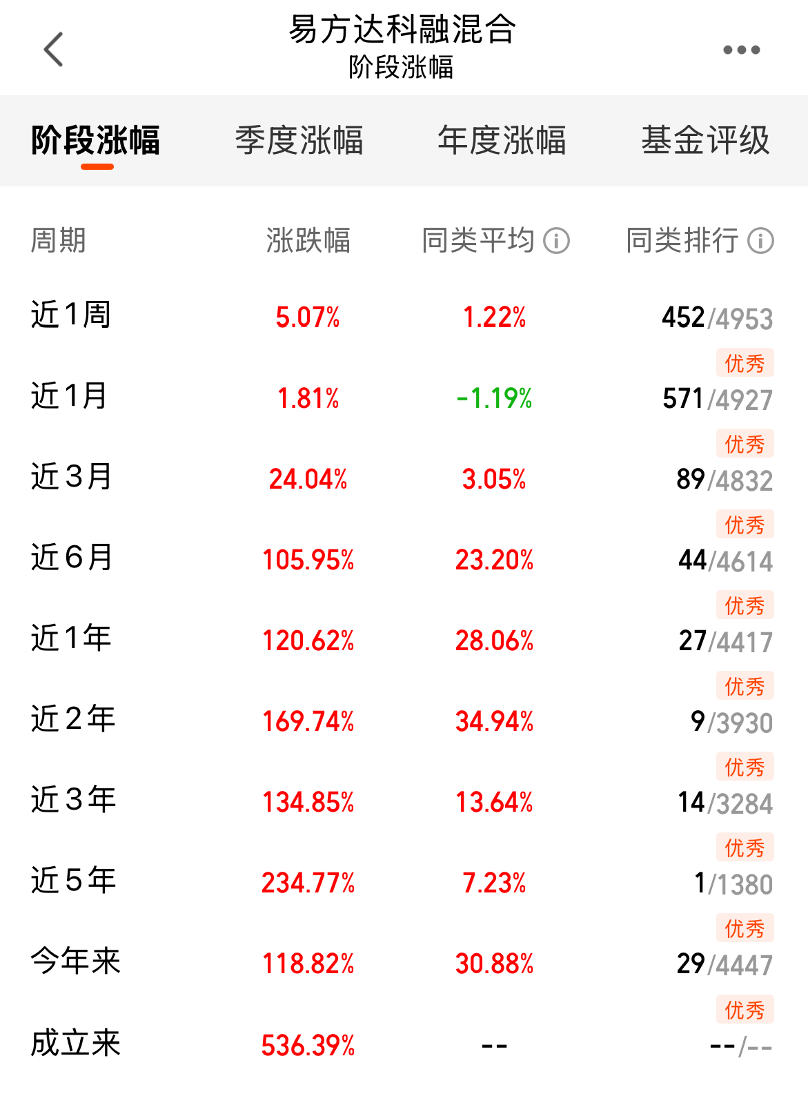 躲过下跌就会躲过上涨!震荡市的操作难度就很大,尤其是成长板块轮动很快,我觉得均衡布局的混合科技基就比较优势,不错过行情,还能控制回撤。易方达科融混合近一周5%,今年以来118%,业绩是相当优秀。等机会上车了。