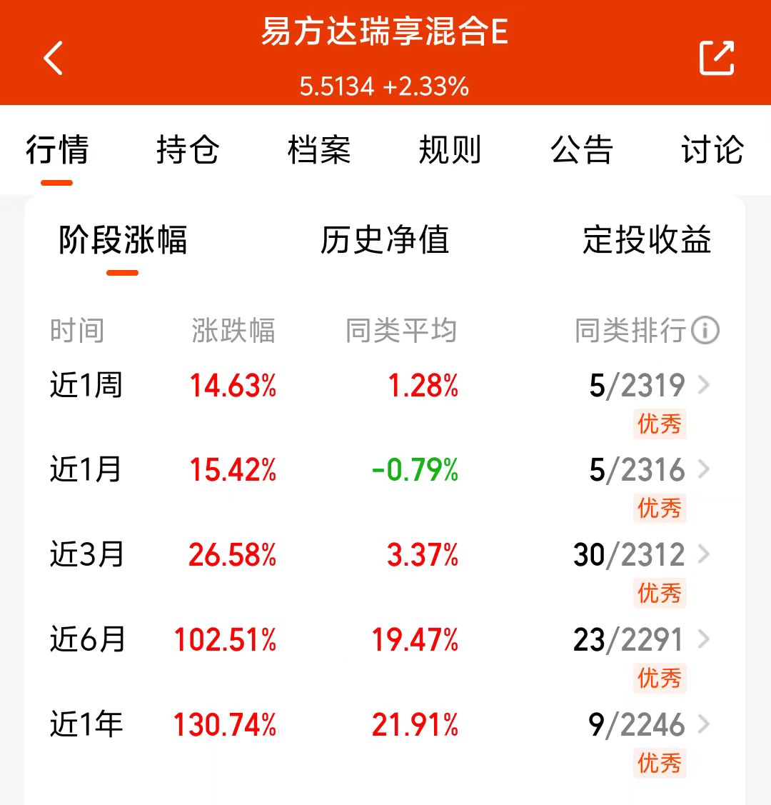 大盘今天震荡调整,三大指数涨跌不一,科技等板块回落,CPO板块表现还不错,今天继续上涨,易方达瑞享混合E近一周涨了14.63%,近六个月涨了102.51%,成立以来业绩已经翻了四倍了,业绩很优秀,经理调仓能力不错,看好这个方向,我准备分批布局!