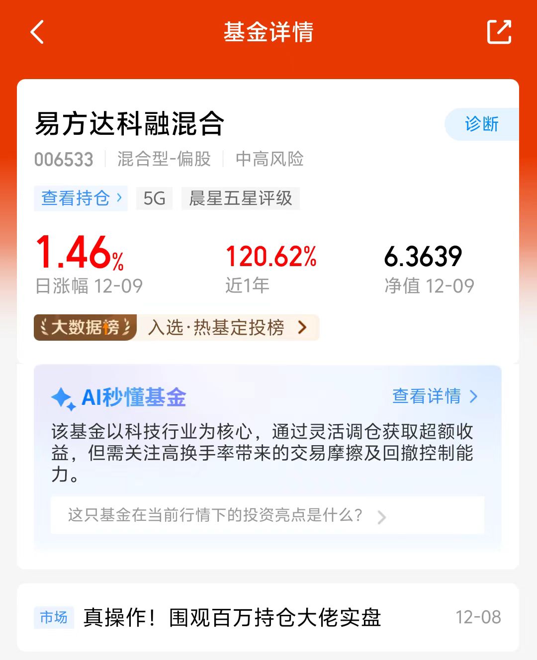 大盘今天震荡调整,科技等板块回落,近期市场波动加剧,单一市场风险比较大,易方达科融混合持仓有科技、新能源和军工等板块,持仓比较均衡,轮动配置,近六个月涨了105.95%,成立以来涨幅536.39%,业绩很优秀,经理调仓能力不错,我打算分批加仓!