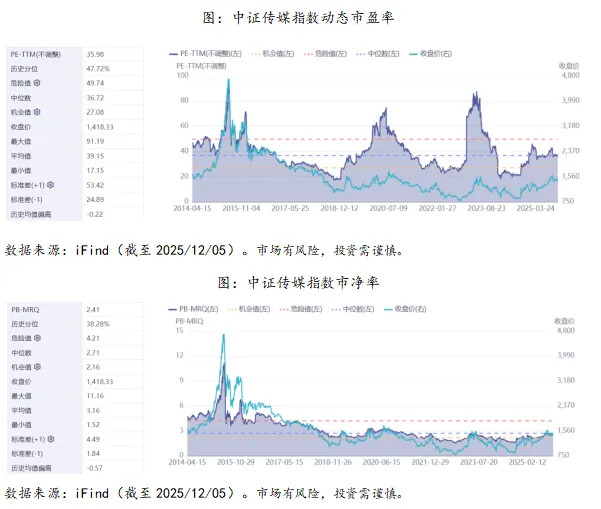 截至2025年12月05日,中证传媒指数动态市盈率为35.98倍,位于指数上市以来47.72%历史分位数;市净率为2.41倍,位于上市以来的38.28%分位数。