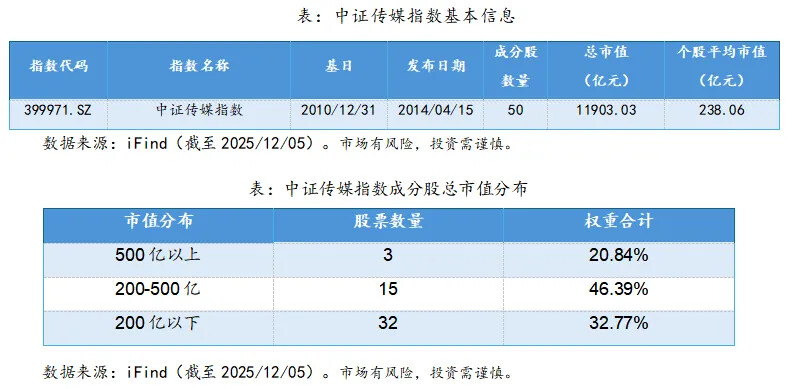 中证传媒指数(399971.SZ)从营销与广告、文化娱乐、数字媒体等行业中,选取总市值较大的50只上市公司证券作为指数样本,以反映传媒领域代表性上市公司证券的整体表现。