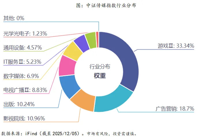 按照申万二级行业分类,指数前五大细分行业分别为游戏Ⅱ(33.34%),广告营销(18.7%),影视院线(10.96%),出版(10.24%),电视广播Ⅱ(8.83%)。此外还有数字媒体、IT服务等。行业分布丰富,未来成长性高。