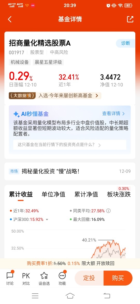 就在心灰意冷之际,贴心的天天基金给木同学推荐了招商量化精选股票 。木同学注意到这只基金是晨星五星评级产品,且在 2022 年市场大跌的环境下,业绩表现远超同类——虽然全年最终收益为 - 1.06%,但在同类725只基金中排名第25,更是大幅跑赢沪深300指数近20个百分点。抱着“死马当活马医”的心态,木同学在2022年 3月,用账户里仅剩的2万元闲钱,分批买入了这只基金。