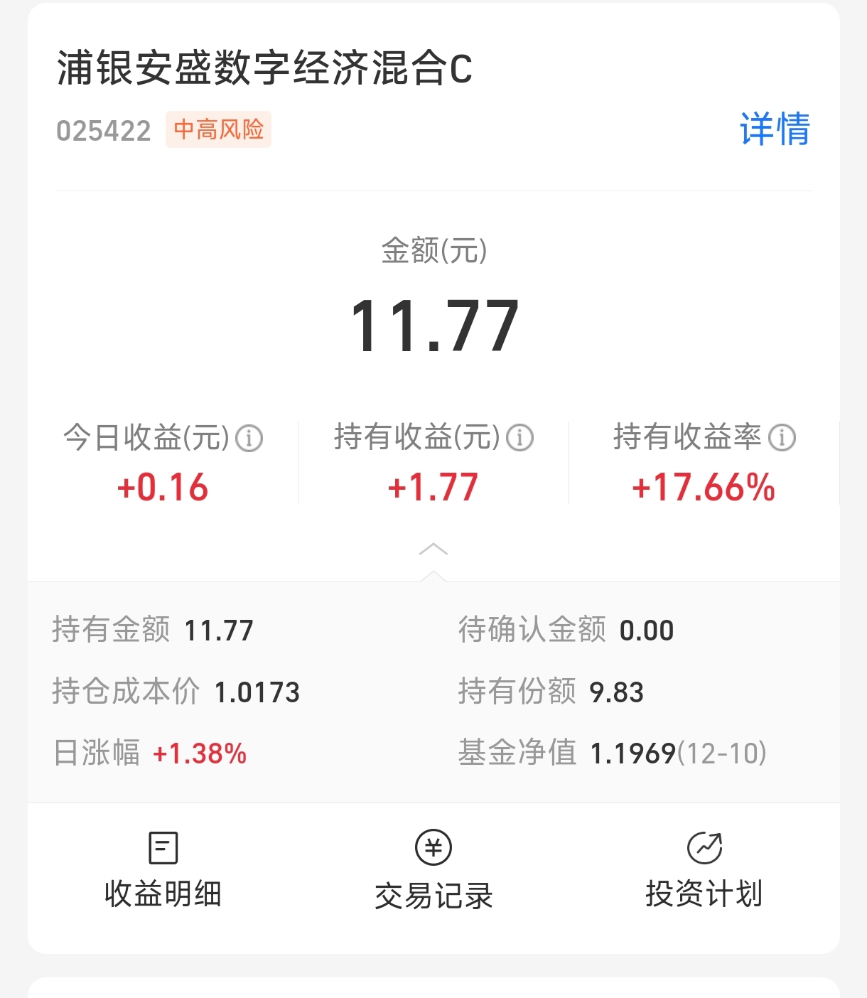 $浦银安盛数字经济混合C(OTCFUND|025422)$持仓最少的却是涨的最好的,连续涨了6天没停过!