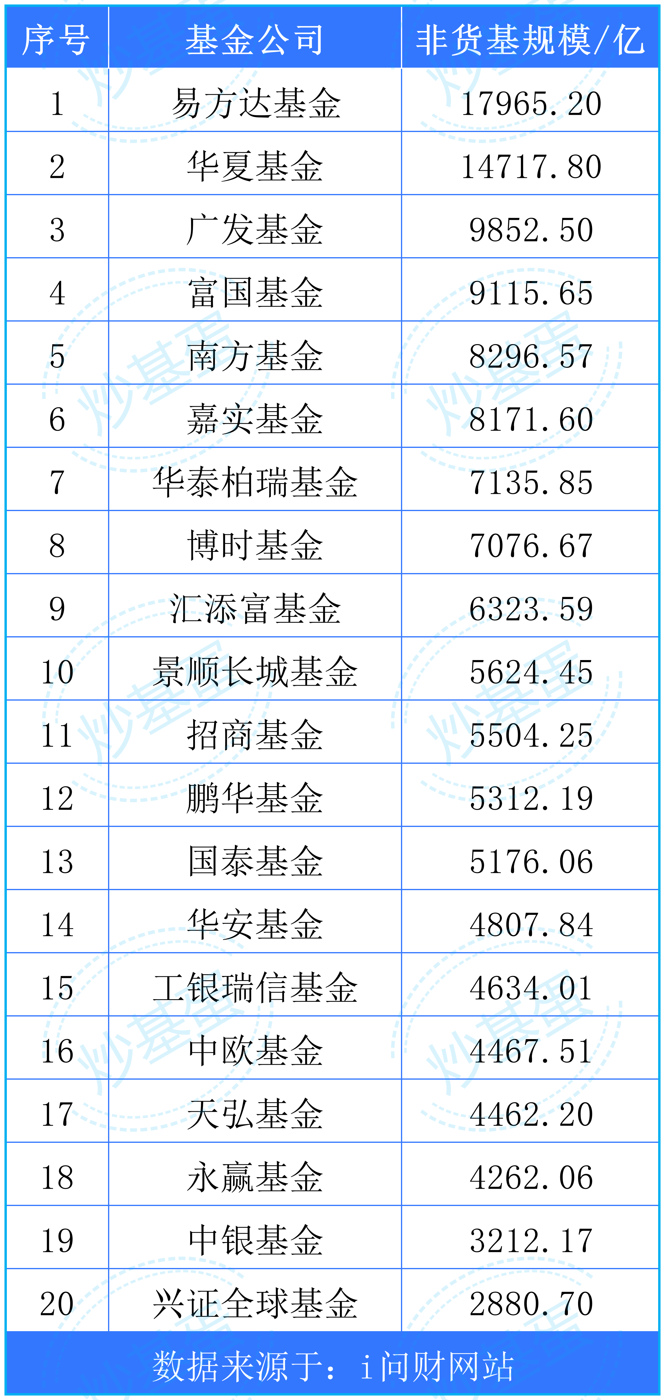 1.选择基金公司实力较强,可以看看非货规模靠前的公司。这个数据原来协会一直公布的,今天写文章的时候发现,竟然不公布了。找第三方数据贴下: