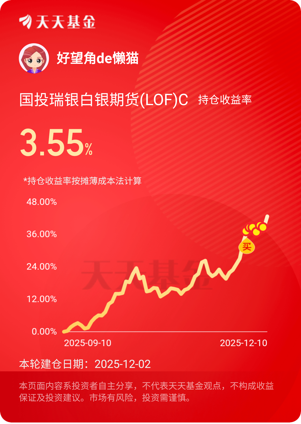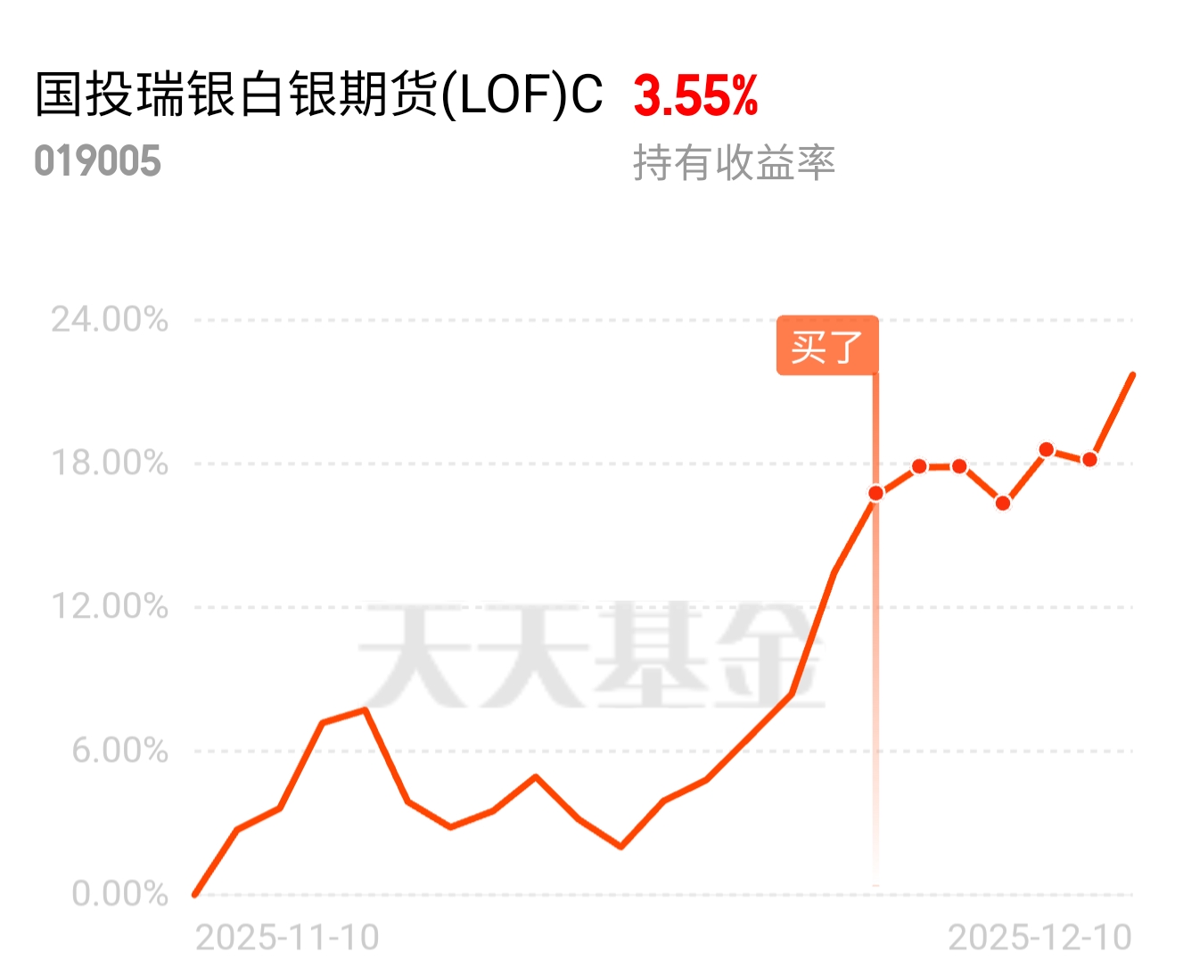 白银的逼仓行情还在继续,银价连创纪录。白银2025年年内的涨幅高达102%,相比起来黄金的59%涨幅就是个弟弟。白银的突飞猛进,考虑之前的仓位太小,场内溢价又太高了,还是场外追涨了白银。白银的基金之前低波阶段进进出出玩过几波,可可惜仓位没守住,白银的波动率啊真心难拿住。