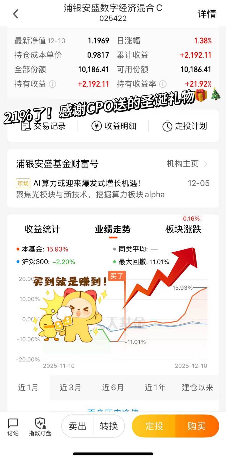 $浦银安盛数字经济混合C$这个CPO新晋黑马单日上涨1.38%,除了中间小跌1天