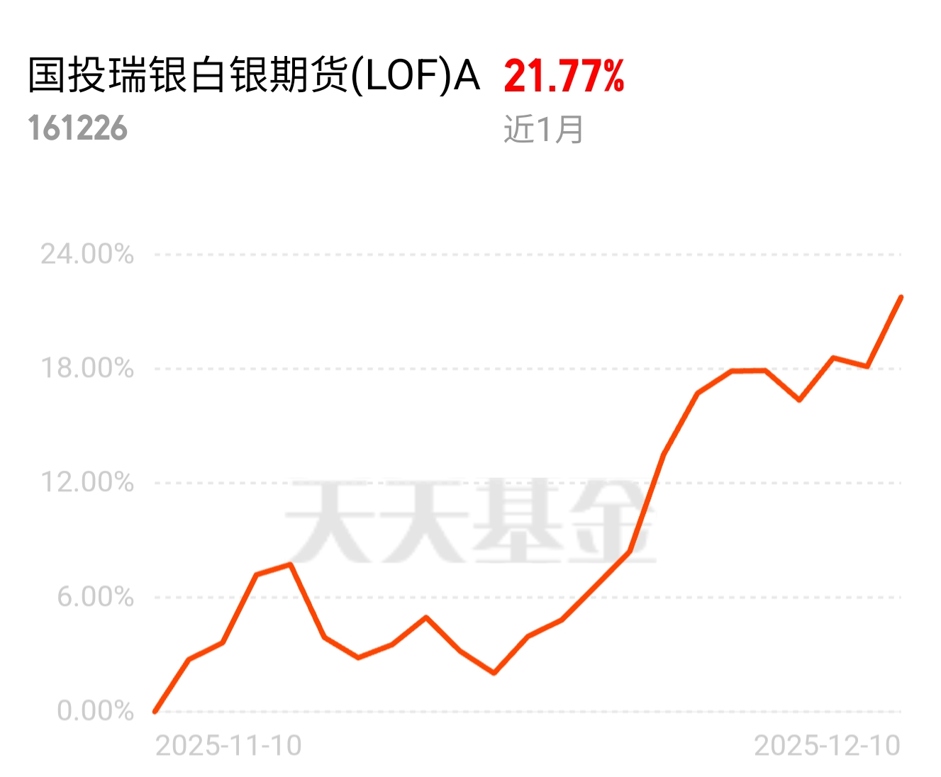 白银的逼仓行情还在继续,银价连创纪录。白银2025年年内的涨幅高达102%,相比起来黄金的59%涨幅就是个弟弟。白银的突飞猛进,考虑之前的仓位太小,场内溢价高了,还是场外追涨了白银。白银的基金之前低波阶段进进出出玩过几波,可可惜仓位没守住,白银的波动率啊真心难拿住。