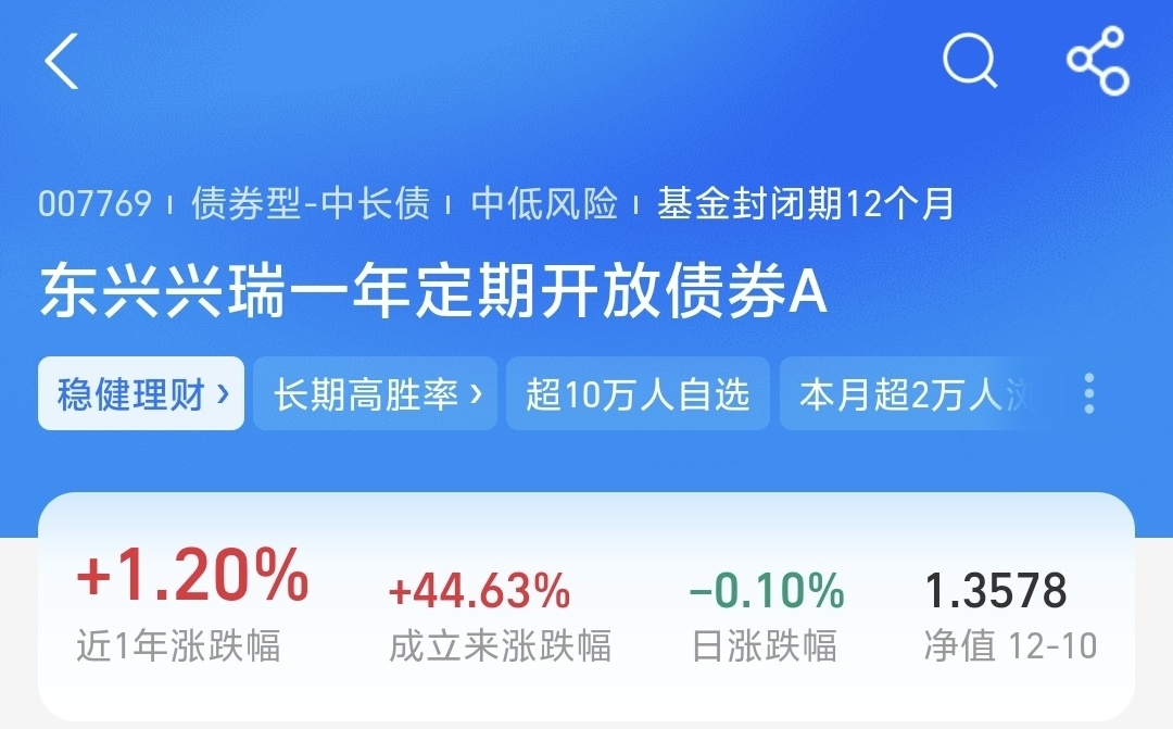 中长债市昨日走出低开高走的修复行情,回暖信号很清晰。我打算$东兴兴瑞一年定开A$ 开放申购的机会来点,这只基近一年赚120个蛋,成立以来涨幅有44.63%,基金经理的实力在线。值得一提的是,这位经理还管理着东兴鑫颐3个月滚动持有,这是一款低波固收+产品,搭配了可转债仓位,在股市向好阶段也能吃上肉。$中加聚鑫纯债一年定开C$ $兴业启元一年定开债C$
