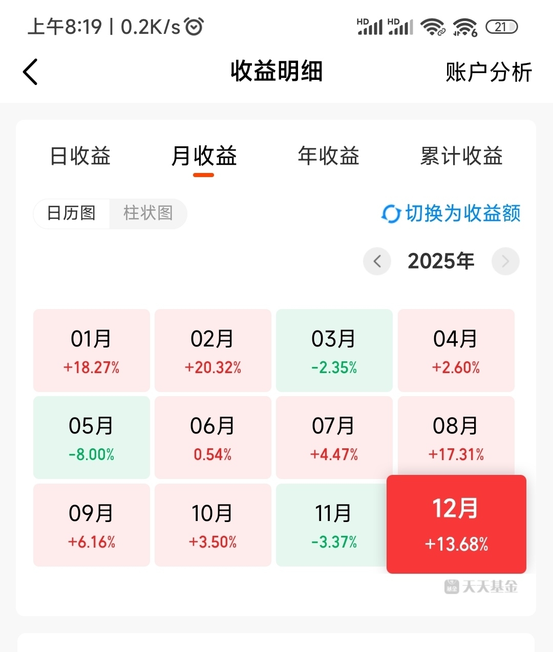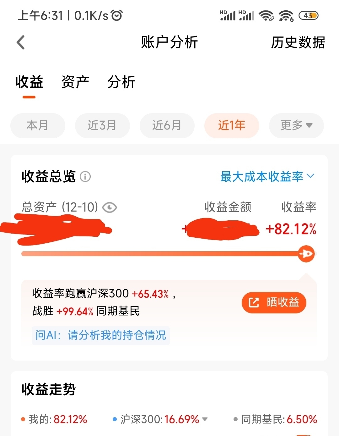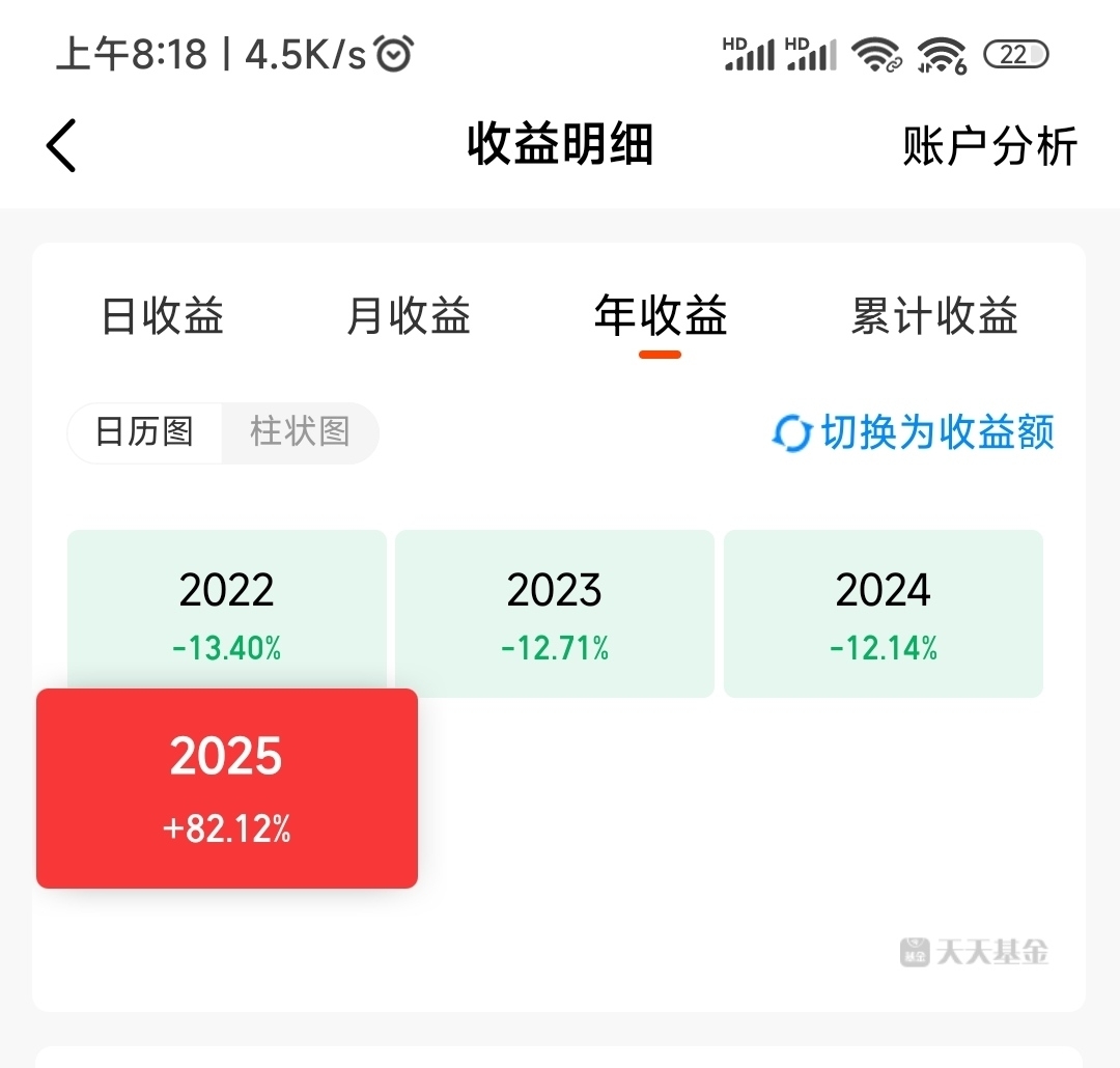 今年,我的基金收益率达到了82%,虽然在天天基金平台里不是最好的,但我自己却非常满意和满足。因为自从我2022年入驻天天基金平台以来,连续3年亏损,累计亏损39%,本金只剩61%,欲哭无泪。今年我终于扭亏为盈,还大大超出我的收益预期,所以我非常开心并满足。同时我告诫自己,任何时候都不能气馁和放弃,要相信努力和付出终有回报。在小有收获时,不能有丝毫的自满和松懈,这是万里长征迈出的第一步,革命尚未成功同志仍需努力。