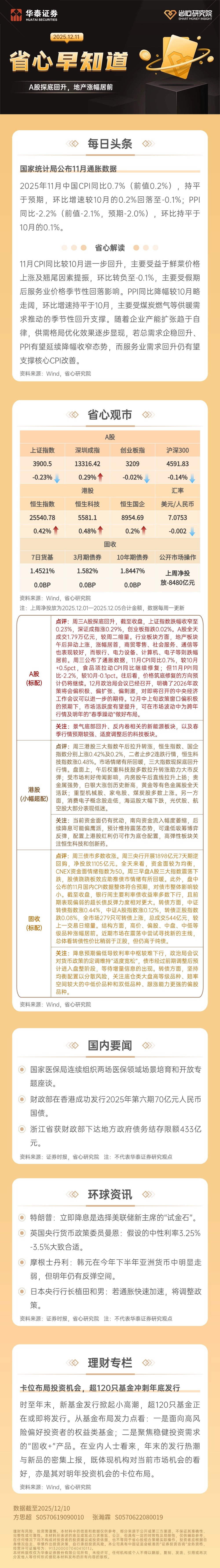 周三A股探底回升,截至收盘,上证指数跌幅收窄至0.23%,深证成指涨0.29%,创业板指跌0.02%。A股全天成交1.79万亿元,较周二缩量。行业板块方面,地产板块午后异动上涨,涨幅居首,商贸零售、社会服务、通信等也表现较好,而银行、电力设备、计算机、电子等则跌幅居前。周三公布了通胀数据,11月CPI同比0.7%,较10月+0.5pct,食品项拉动CPI同比继续修复;但11月PPI同比-2.2%,较10月-0.1pct。往后看,价格筑底修复的方向预计仍将继续。12月政治局会议已经召开,明确了2026年政策将会偏积极、偏扩张、偏刺激,对即将召开的中央经济工作会议可以进一步的期待。12月中上旬政策窗口偏积极的预期下,市场活跃度有望提升,可在市场波动中为跨年行情及明年的“春季躁动”做好布局。