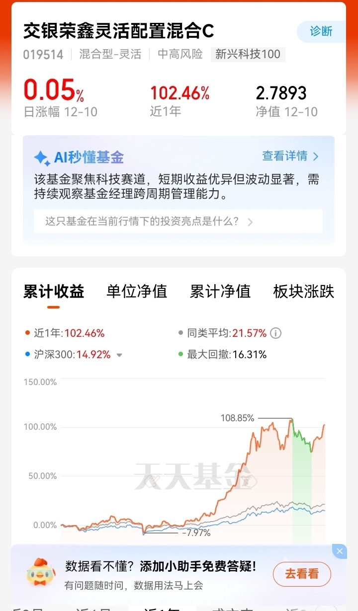 资金持续净流入,半导体新政发力,交银荣鑫重仓科技制造股,近一年涨超102%,可小笔参与跟着行业趋势。
