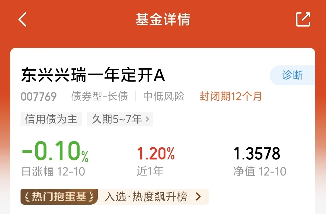 最近债市行情还不错,昨天又上涨了,随着降息到来,债市行情大概率也要好起来。$东兴兴瑞一年定开A$ 现在能申购了,我打算来点,因为这个近一年收120个蛋,成立以来涨超44%,挺不错的。