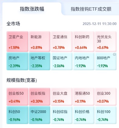 卫星产业、新能源、光伏龙头等涨幅靠前,地产跌幅偏大。