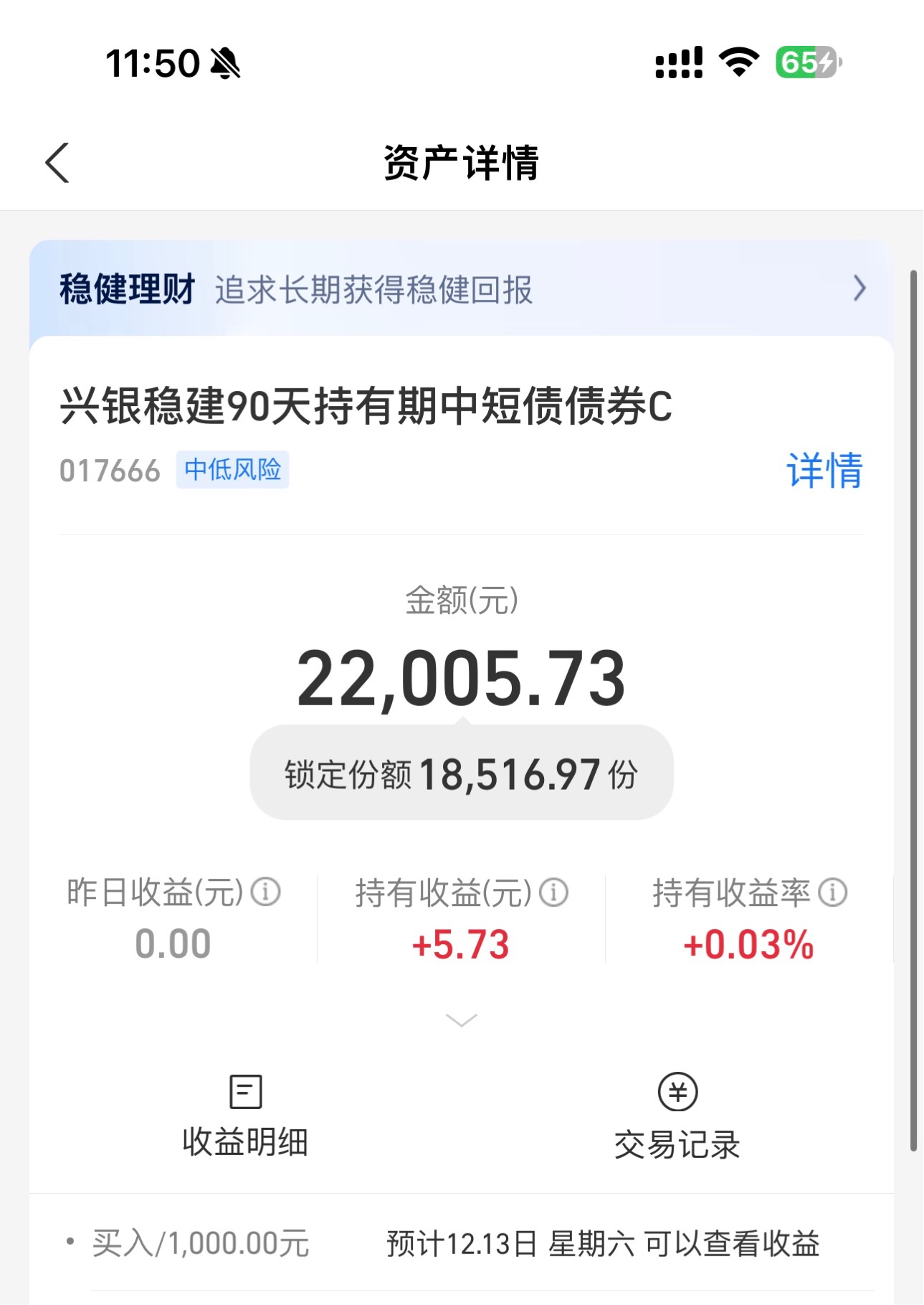 $兴银稳建90天持有期中短债C$ :小王今日继续红包1000-0.8上车,一上车就送8个蛋,红包上车真好呀;这只基金近期表现可圈可点,在市场回调阶段不仅稳住净值没“碎蛋”,最近也是一直再稳稳收蛋,这样的稳健表现值得我继续为它定投上车。尤其在当前市场震荡的大环境下,我更喜欢布局这类稳健型中短债基金;从最新三季度持仓来看,该基金聚焦短融信用债赛道,票息策略成效显著;基金经理始终将严控回撤放在首位,再在此基础上争取更优收益。拉开长期收益来看:该基金近一年收益率达2.18%,对比银行定期存款,既多了一份灵活申赎的便利,收益表现也更占优势。综合多方因素考量,我决定今日继续定投加仓1000元