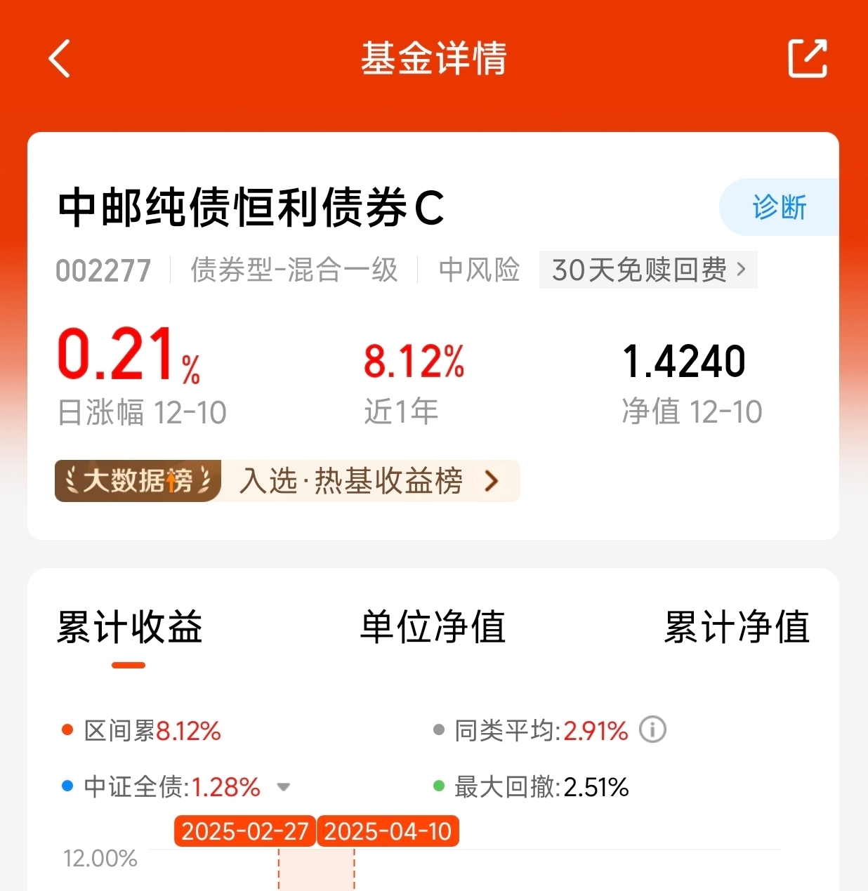 我在#茅台批价触及1500元 “挤泡沫”何时结束?# 选择了“严重低估” 虽然是已经低估值了,但是不反弹也是没办法,不如自己提前改变方向,$中邮纯债恒利债券C$ 操作起来,主投可转债和纯债,没有股票,股债切换合适,昨天21个蛋