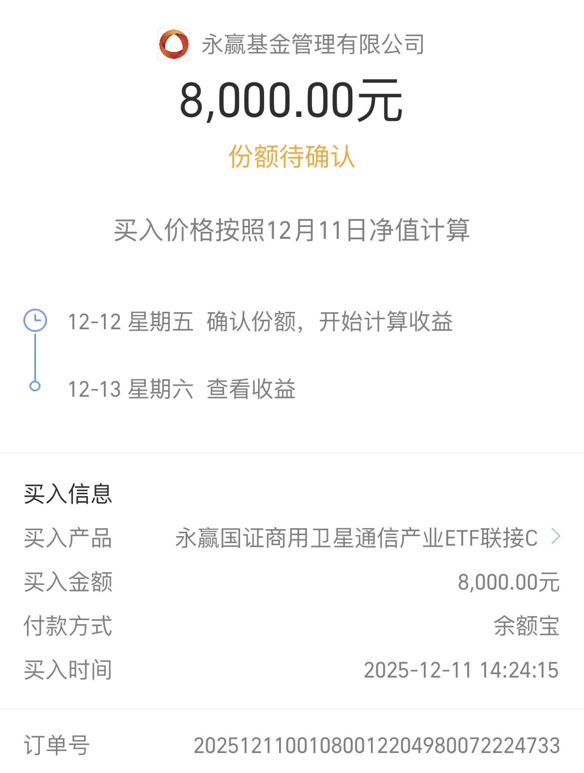 #美联储宣布降息25个基点 如何布局?# 今天市场震荡调整,如同这突然变冷的天气一样,心里拔凉拔凉的,身心都受到了影响,不过这只场外的卫星基,还蛮稀缺的,永赢卫星通信产业ETF联接紧跟航天产业链,是实打实的“太空赛道”,今天就小小加一点,蹭波产业热度,期待拉升咯