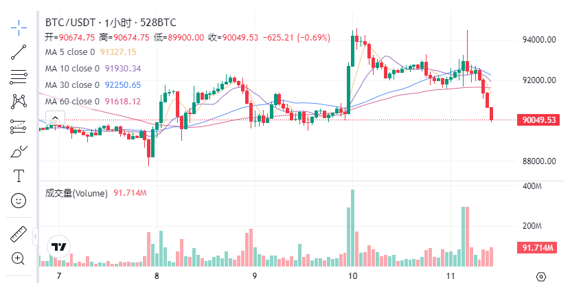 尽管 25 个基点的降息及购债计划理论上构成市场利好,但 “1 月难续降” 的隐含信号迅速主导情绪,数字货币市场随即上演 “冲高回落” 戏码 —— 与前期预判一致,比特币盘中最高触及 94500 附近后快速回落,截至 12 月 11 日 10:36,价格已回落至 90000 附近区间;以太坊同步冲高至 3450 附近,此后震荡下行至 3280 附近,两大主流币均已完全抹去会议期间的短线涨幅。