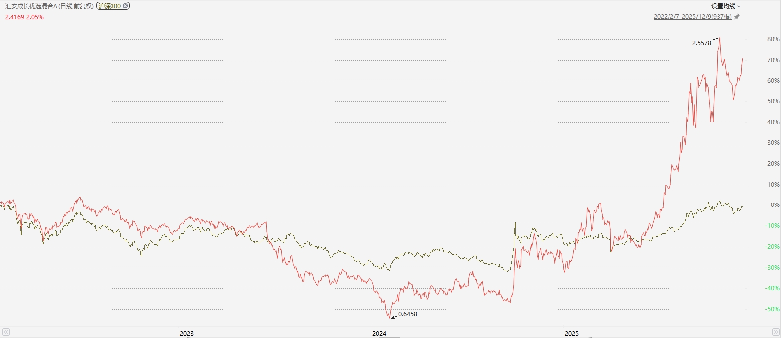 汇安成长优选是聚焦科技成长赛道的主动基金,基金经理单柏霖自2023年6月19日开始管理,近一年收益翻倍,达到121.35%,跑赢沪深300指数105.62%,表现出犀利的进攻性。(来源:Wind,截止2025/12/9,A类份额)