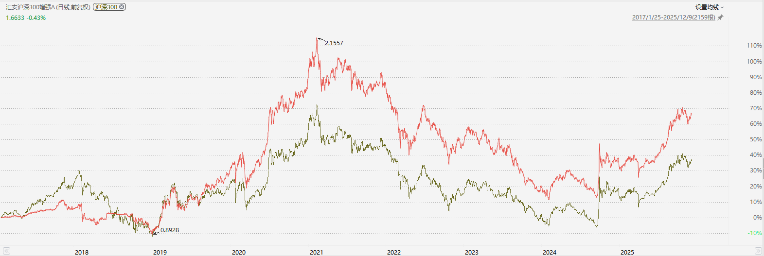 汇安沪深300指数增强基金是增强型宽基指数基金,今年以来收益率达到22.24%,跑赢同期沪深300指数5.38%,超额收益突出。(来源:Wind,截止2025/12/9,A类份额)