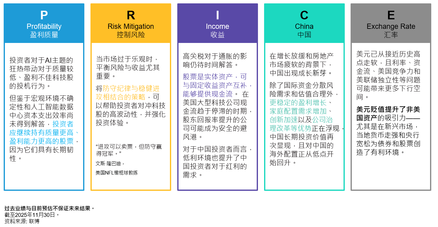 站在2026年的门槛上,我们对未来一年的展望概括为“审慎乐观”。乐观源于宏观环境正向着“金发女孩”(Goldilocks)式的理想状态演进;审慎则源于当前资产价格已在一定程度上反映了较好的经济与盈利预期,且市场内部的估值分化达到了极致。在这样一个充满机遇但容错率降低的环境中,投资者需要的不再是盲目的贝塔(Beta) 追踪,而是基于P.R.I.C.E. 框架 (盈利质量、风险控制、收益、中国机遇、汇率) 的着眼于全球权益市场的配置机会。